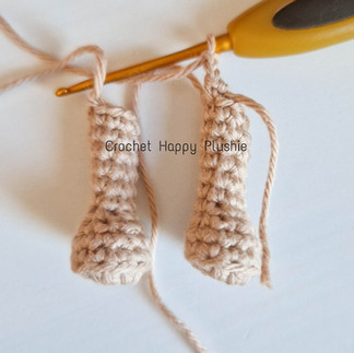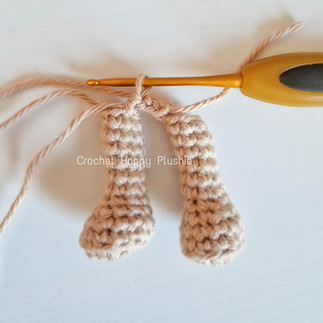 | - Cut yarn, make 2nd leg. Do the same for 2nd leg - Insert hook in 6th stitch of right leg. Sc1, ch2, insert hook 6th stitch of left leg, sc. Place marker in this sc. We’ll start counting from 1 again. :) | |